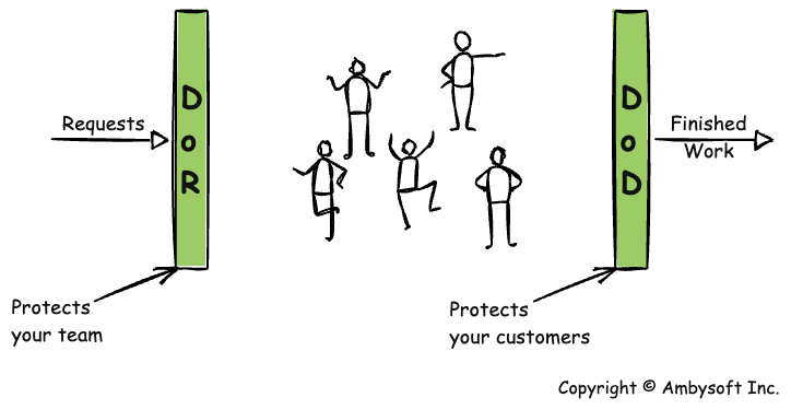 “Agile teams typically have two explicit quality gates, although they don’t like calling them that,” responds Carol. “These gates are the Definition of Ready (DoR) and the Definition of Done (DoD). The team’s DoR protects them from poor-quality requests, typically poorly described requirements. The DoR is a quality gate that work requests must pass through to get to the team. Similarly, the DoD is a quality gate that the team’s work must pass through before it can be sent to downstream recipients. These recipients would include the independent testers, AI development teams using Converge for training or operational data, and our business partners who are using Converge to access data to help them make better decisions.”